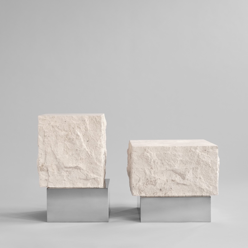 Finisaj : baza metalica cu finisaj cromat oglinda, blat calcar, o piatra naturala, cu textura organica si variatii subtile